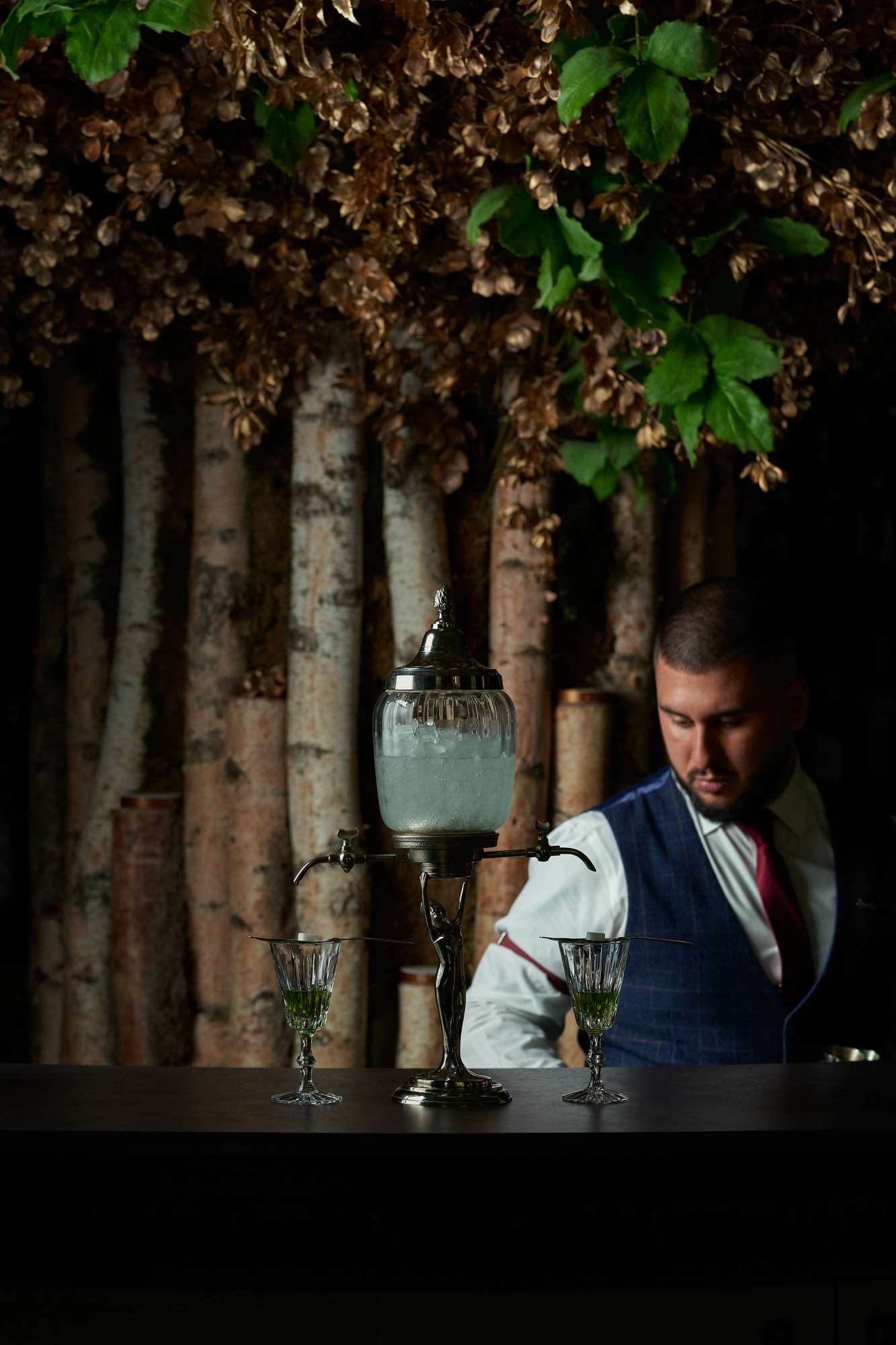 - Glenmorangie Tale of the Forest – Hennessy VS – Calabro Porcino Liqueur – Electric Bitter – Peychaud’s Bitter – Jade Terminus Oxygenee Absinthe