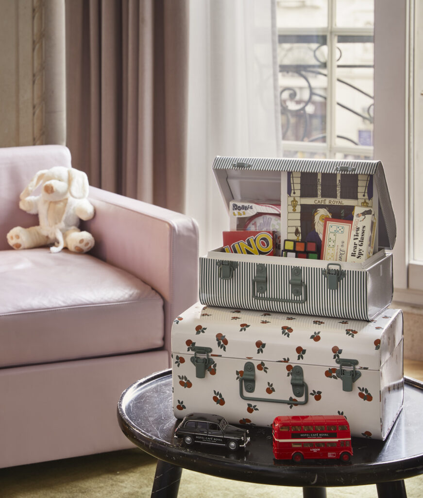 Hotel Café Royal, in partnership with Louenna Hood, the trusted Norland Nanny to numerous royal families, proudly earns the Royal Nanny Seal of Approval. Our family-friendly rooms and custom children’s menus have been meticulously evaluated, ensuring peace of mind for parents and caregivers. Enhancing the experience, the Tiny Traveller Programme offers specially crafted trunks, collaboratively designed with Nanny Louenna, containing essential items for parents, as well as toys, puzzles, games, and books to entertain little ones. When reserving your stay, simply include the trunk as an ‘additional offering,’ and it will be ready upon your arrival, lightening your load and alleviating packing stress.